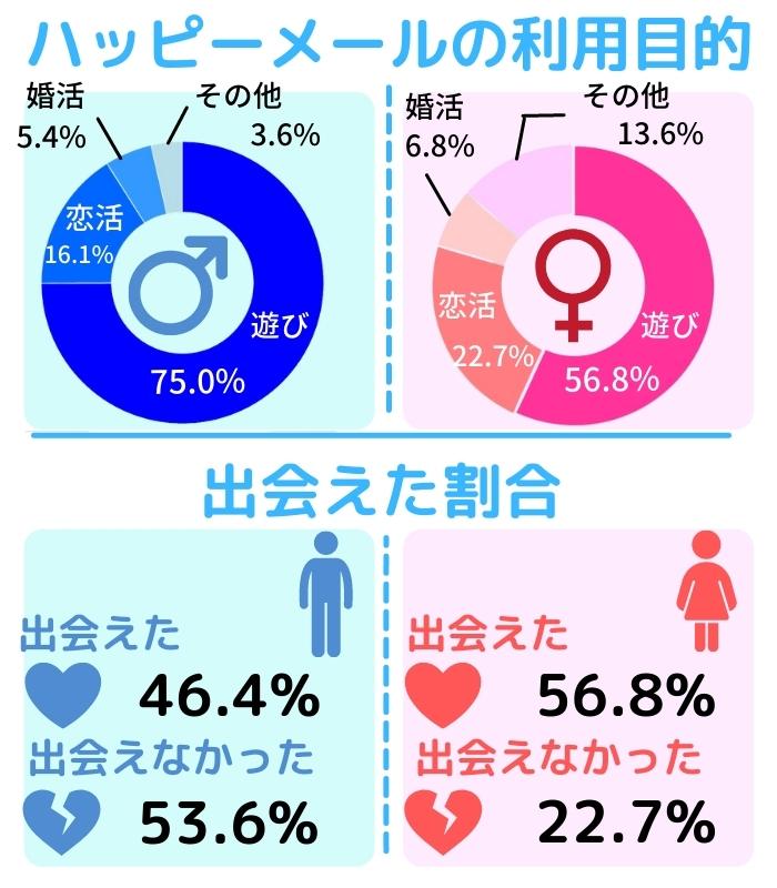 ハピメユーザー100人を対象にしたアンケートでは、男性の75%・女性の56.8%が遊び目的という結果で、カラダを求めているユーザーが多いことが窺えます。